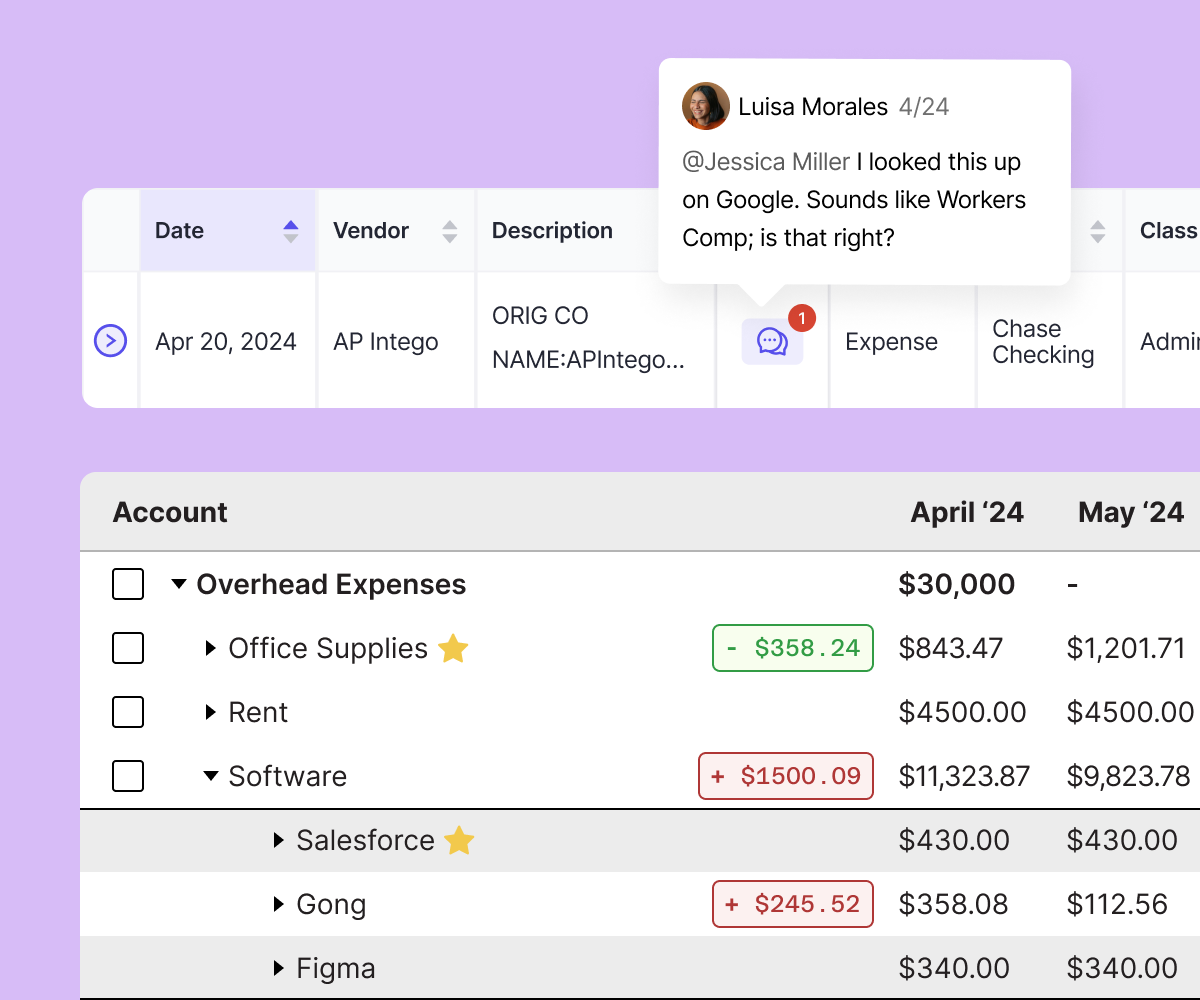 Drill down on individual transactions at the vendor level without opening up Excel, QuickBooks, or Xero. Identify cost drivers and variances so you can assess, budget, and advise your clients for their financial success.