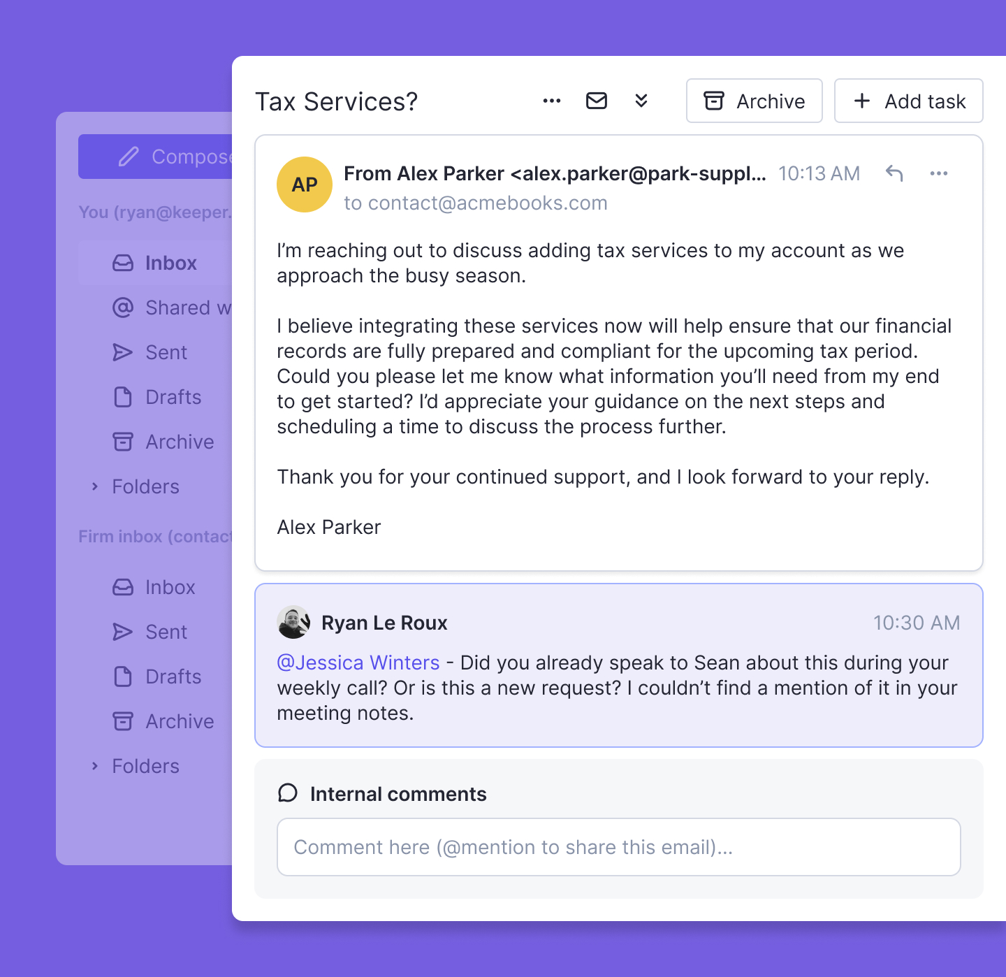 Forwarding emails or looping your teammates onto existing threads only adds to inbox clutter. Keeper Emails promotes collaboration by giving your team the ability to leave comments, ask questions, and tag teammates under specific messages that need additional attention.