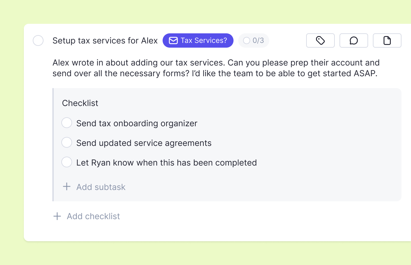 Link to existing tasks or create new ones--they'll automatically populate in the client's tax or month-end workflows. Create custom views to stay on top of any one-off email tasks throughout the month.