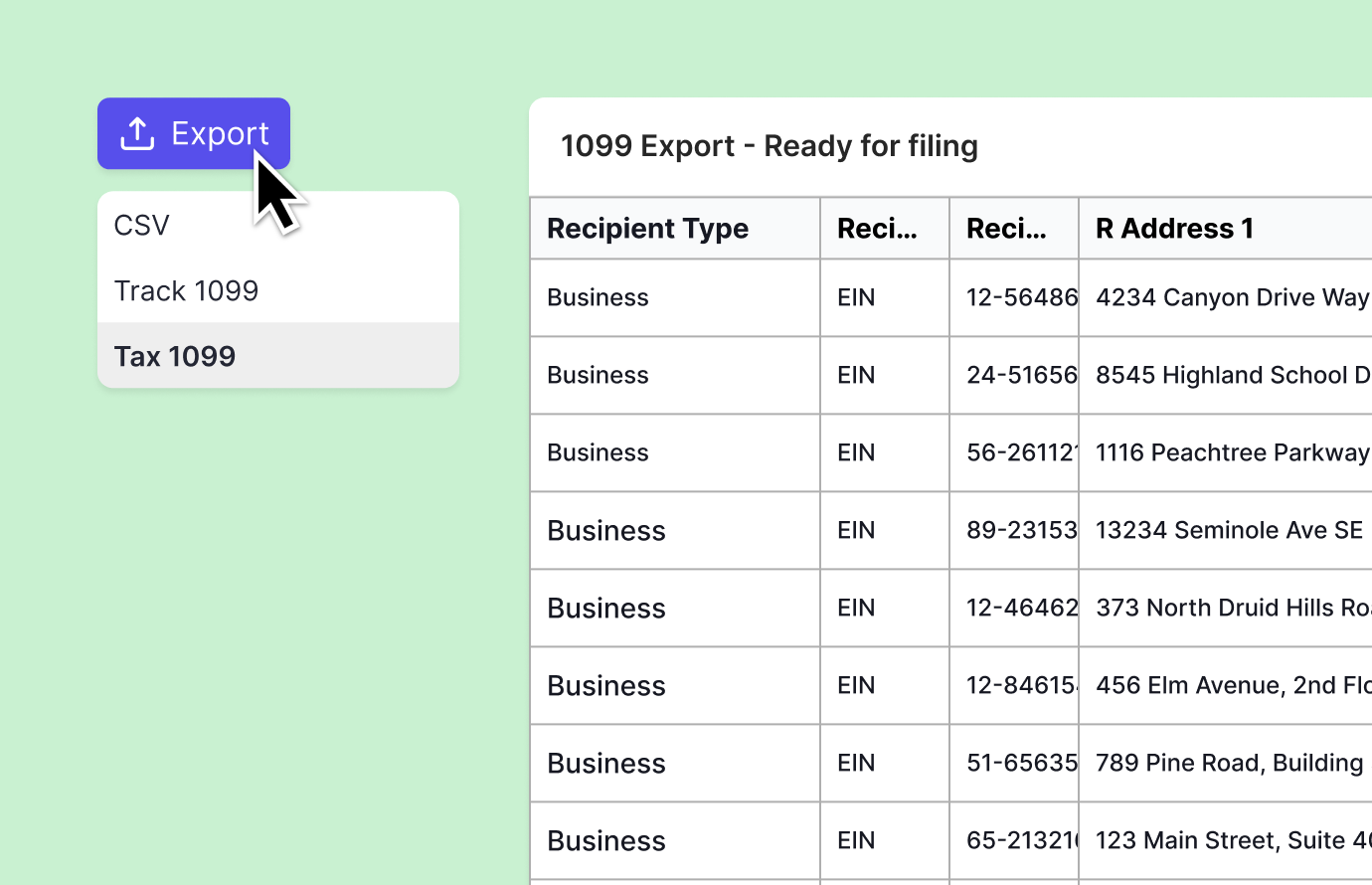 Export all 1099-related data (in your preferred file format) to Track1099 or Tax1099 for filing.